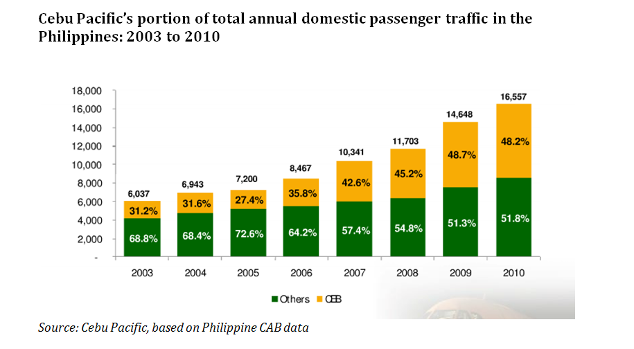 Cebu Pacific has seen its domestic traffic increase by 10% through the first three quarters of 2010 to 6.7 million passengers. The carrier also transported 2 million international passengers through the first nine months of 2011, a 25% increase compared with last year. Last year Cebu Pacific transported over 8 million domestic passengers, accounting for 52% of the 16.6 million total passengers in the Philippine domestic market.