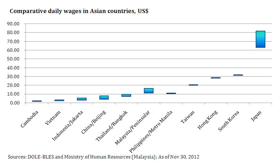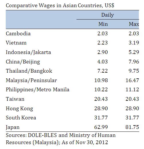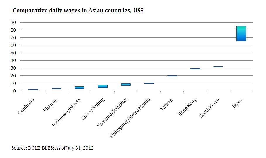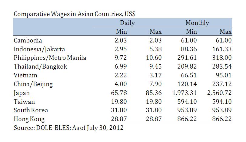 In addition, the price of rice and other food in China, Thailand, and Vietnam is lower than in the Philippines. The Philippine worker must earn more than his regional counterpart to feed a larger family, with less help from income earned by other employed family members.