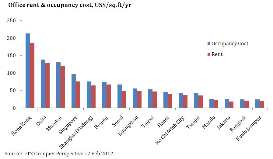 Renting office space in Manila is a relative bargain, according to the latest data from the CB Richard Ellis publication Global Office Rents, May 2010. Rentals in Manila (US$ 24.38 per square foot) are higher than in Jakarta (US$ 17.89), similar to Bangkok (US$ 23.54) and Guangzhou (US$ 27.50), and less than Bangalore (US$ 33.28), Ho Chi Minh City (US$ 48.56), and Taipei (US$ 45.09). Rents in Singapore (US$ 57.49), Shanghai (US$ 60.14), Seoul (US$ 71.82), Hong Kong (US$ 80.27), are two to three times higher than Manila, while Tokyo (US$ 143.99) is six times more (see Figure 145).