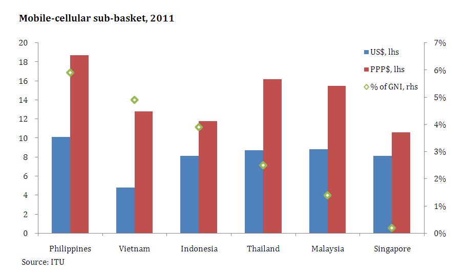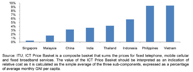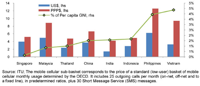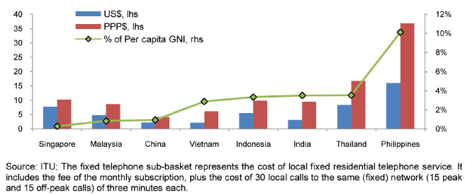 Telecommunication costs are also higher in the Philippines than other ASEAN-6 economies and China and India, whether measured in US$ or Purchasing Power Parity (PPP), according to International Telecommunication Union (ITU) data. The four figures below (Figures 147, 148, 149, and 150) show the Philippines is the most expensive of eight economies for the monthly costs of a fixed line, a mobile phone, and broadband.