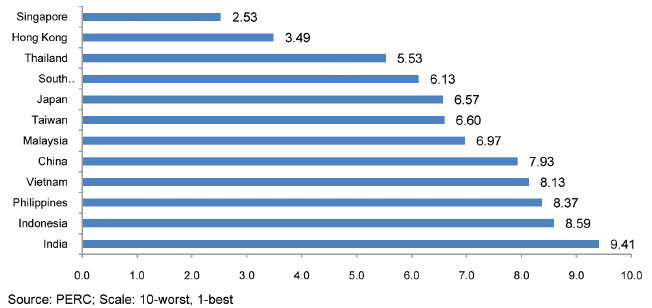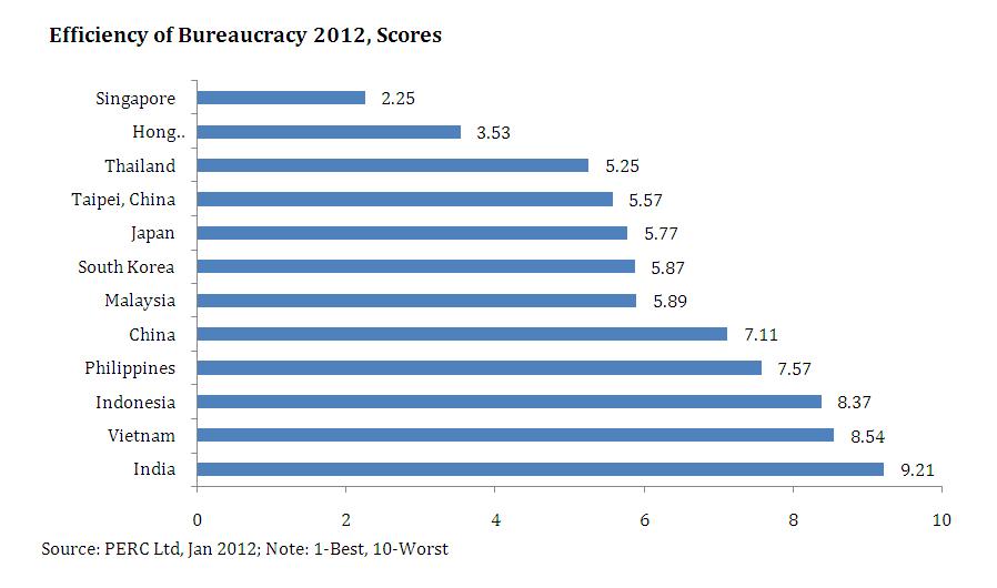 Respondents to a 2010 survey by the Political and Economic Risk Consultancy (PERC) in Hong Kong on the efficiency of bureaucracy in Asia rated the quality and efficiency of the civil service in Singapore as the best in Asia and the Indian bureaucracy the worst. The civil services of China, Indonesia, the Philippines, and Vietnam were each graded poorly, but not as bad as India (see Figure 152).