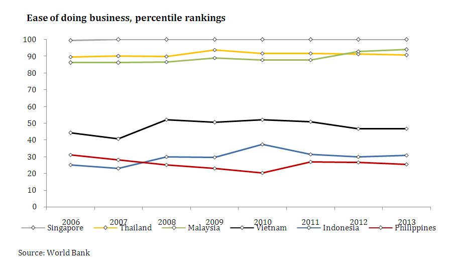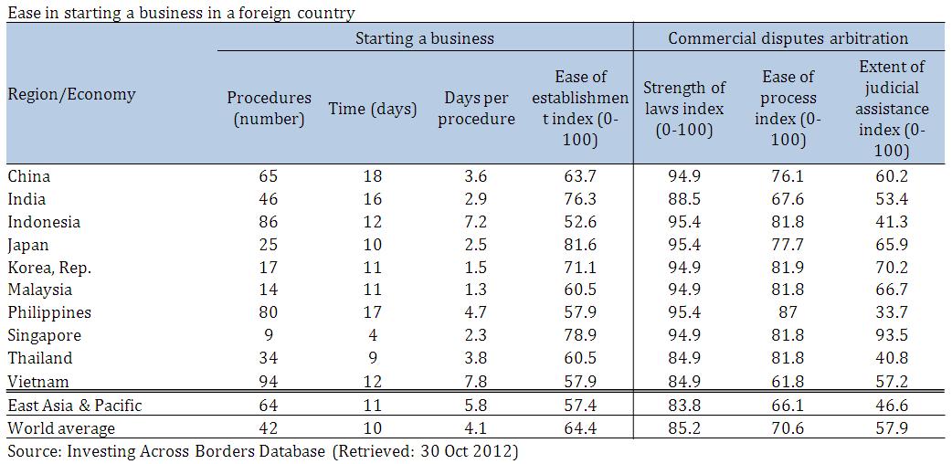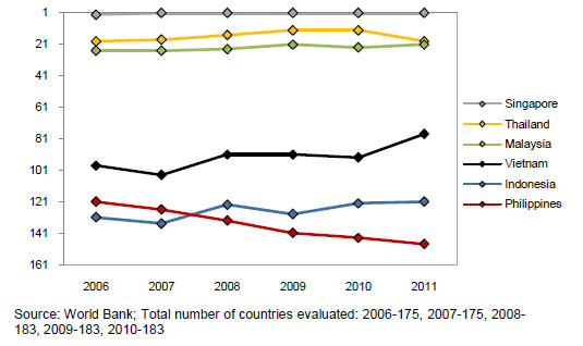 The World Bank Foreign Investment Advisory Service global rating of 87 countries Investing Across Borders measures the ease for foreign companies to start a business. Among the Asian economies covered by the survey, the Philippines was low-ranked along with Vietnam with ratings of 58 each, while Indonesia with 53 was slightly worse (see Table 64 and Figure 155).