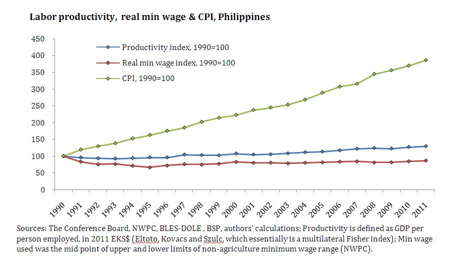 If wages, adjusted for inflation, have maintained a strong correlation with productivity, then other factors may be responsible for the relatively higher minimum wage in the Philippines. Inefficiencies in the economy increase prices of domestic goods (e.g. electricity, rice, and transportation), and the high population growth rate and absence of an effective population management policy create an environment that challenges the ability of Filipino workers to earn enough to support their often-large families. Unfortunately, the market forces of international competitiveness do not take such local factors into account. Other policies than regular increases in minimum wages could be considered to support the lowest-paid workers, such as conditional cash transfers, food stamps, and exemption from income taxes.190