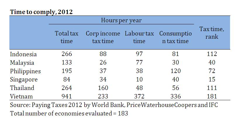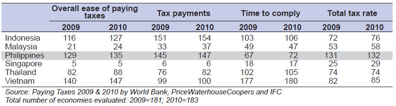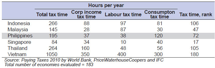 View original figure hereAnother measure of the paperwork burden on Philippine firms is the number of hours per year spent complying with tax payments, as measured by the Paying Taxes 2010 survey of the World Bank. While Singapore requires 84 hours to complete payment of consumption, corporate, and labor taxes, the Philippines requires 195 hours (see Table 62). The Philippines, however, is mid-ranked among the ASEAN-6 between the better performing Singapore and Malaysia, and ahead of the worst performing Thailand, Indonesia, and Vietnam (see Table 63). The Philippines also has, among the ASEAN-6, the highest total fees rate.