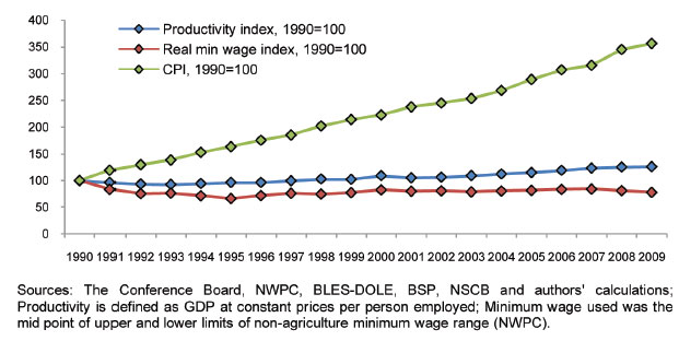 Over the last two decades, the Filipino worker has faced rising living costs. Figure 141 shows Consumer Price Index (CPI), minimum wage, and productivity index. While the average national minimum wage rose by 279% during the last 20 years in nominal terms, prices more than tripled ( up 256%) between 1990 and 2009. Food (50% of CPI) rose 225%. Clothing (3% of CPI) rose 168%. Housing (17% of CPI) rose 325%. Fuel, light, and water (7% of CPI) rose 306%. Services (16% of CPI) rose 404%. Minimum wage, when measured in real terms, has closely tracked productivity.