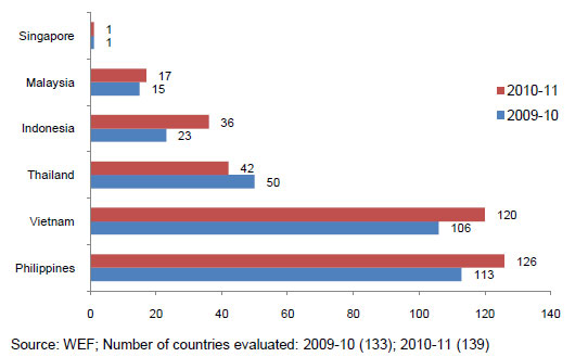 The Philippines measures poorly in most competitive comparisons with the ASEAN-6 economies (see Part 2 Becoming More Competitive), and business costs are an important factor underlying these rankings. The following discusses areas where the country has relatively high business costs, as well as some cost factors where the country is more competitive.