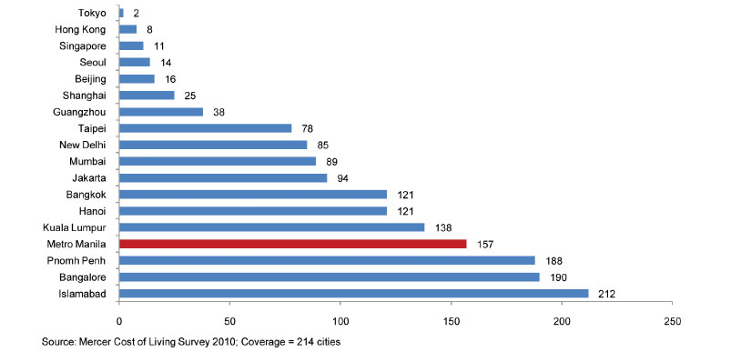 In addition to office rental and telecommunications, another category of business costs where the Philippines compares well to most competitors is the affordable cost of living for executives. Manila remains one of the least expensive major cities in Asia for expatriates, according to the 2010 Cost of Living Survey by American consulting firm Mercer LLC. The Mercer survey is often used by multinationals to decide levels of compensation for employees outside the US.