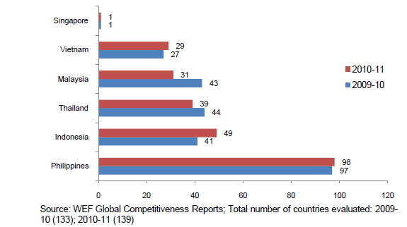 In addition to constitutional restrictions, there are dozens of other restrictions on foreign equity and foreign professionals as well as discriminatory taxes and fees, from which Filipinos but not foreigners are exempt, that should be reviewed to see if they meet the national interest of creating jobs. Figure 167 shows the Philippines significantly lagging behind the rest of ASEAN-6 and ranking in the bottom third of all countries surveyed (98 out of 139) in having a regulatory regime favorable to foreign investment.