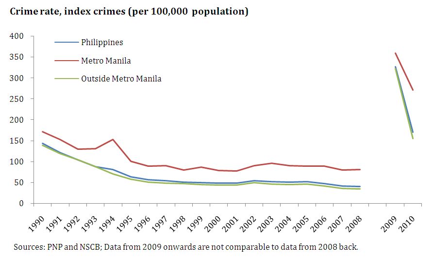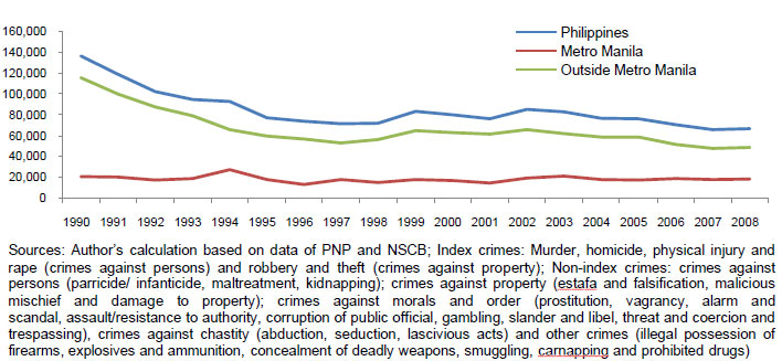The Philippines has a serious crime problem. Poverty and joblessness create an incentive for petty crime which the average Filipino is very likely to encounter in his daily life. According to an SWS survey in 2008, almost 10 percent of respondents stated they had lost property or suffered physical violence in the previous six months. Government statistics as of 2008 measured the crime rate per 100,000 persons for the country at 0.074% (74 persons in every 100,000), while in Metro Manila it was twice as much at 0.155% (155 persons in every 100,000) (see Figure 222).