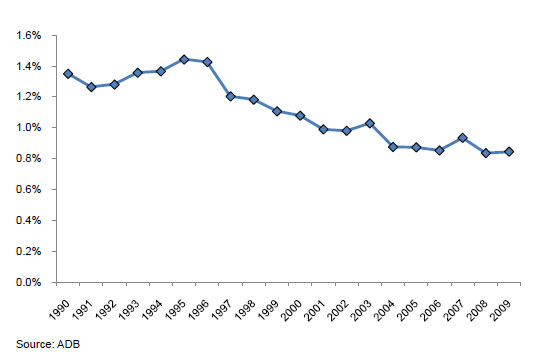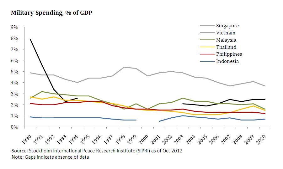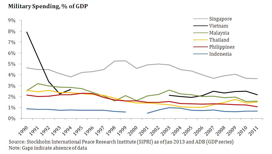 The Philippines spends only 0.85% of GDP on its military, less than any ASEAN-6 country; this amount has slowly declined over the last 20 years (see Figures 228 and 229). A modernization program for the AFP, which started in the mid-1990s, has been very slow to use funds available for the procurement of new equipment.
