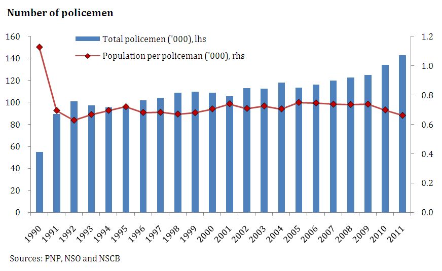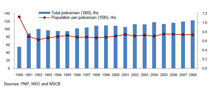 A modern, efficient police force is essential to improving the peace and safety conditions of the country. The current police force strength of 120,000 is too small for a country with a population of 100 mllion (see Figure 230). In 2008, there was just under one policeman for every 1,000 persons. Equipment for the police is poor, especially in rural areas.
