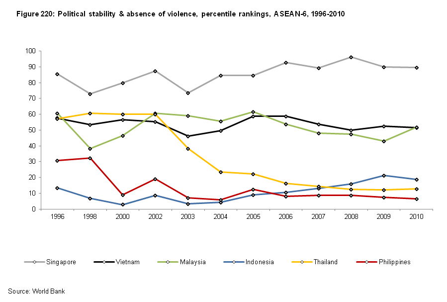 The World Bank measure Political stability and the absence of violence and terrorism shows the Philippines falling to the lowest ranking among the ASEAN-6 in the post-9/11 era. The Philippines, however, is in the company of Thailand and Indonesia; the three are ranked closely together. Thailand and Philippines have declined the most over the last decade, the result of 9/11 and continuing challenges from various armed elements and persistent criminal violence. Indonesia began the decade ranking the lowest and has since then improved. Ratings of the other three – Singapore, Malaysia, and Vietnam – have remained relatively steady (see Figure 220).
