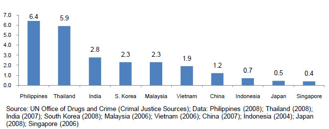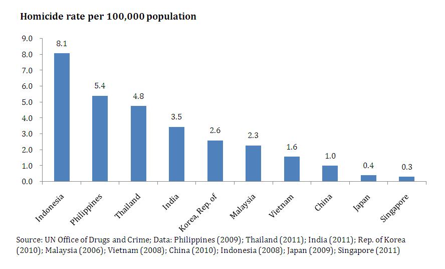 The prevalence of weapons also results in a high level of gun violence. Among the ASEAN-6+4, the Philippines has the highest murder rate, followed closely by Thailand (see Figure 224). The Philippine murder rate is three to 15 times higher than the other countries, except Thailand. There are an estimated 1.2 million unlicensed firearms in the country, contributing to the Philippine rank as number 10 worldwide for gun homicide. Despite the rise in political killings during elections, the gun ban that is generally enforced during campaigns results in lower levels of non-political gun-related violence.