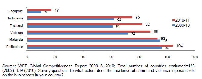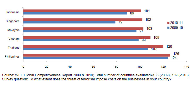The threat of terrorism imposes costs on business operations, which are rated by the WEF in its Global Competitiveness Report. For the ASEAN-6 these are towards the higher end of the 139 countries ranked in 2010 (see Figure 221). For comparison, the US is ranked next to the Philippines at 125 and the United Kingdom at 99. In the Philippines, many private businesses employ private security guards and other security services, creating a business cost which would not be necessary if there were no terrorist activity, less crime, and better police protection.