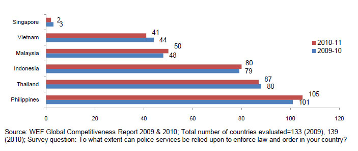 It is not surprising that the perception of the reliability of police services is ranked lower in the Philippines than the other ASEAN-6 countries (see Figure 227).