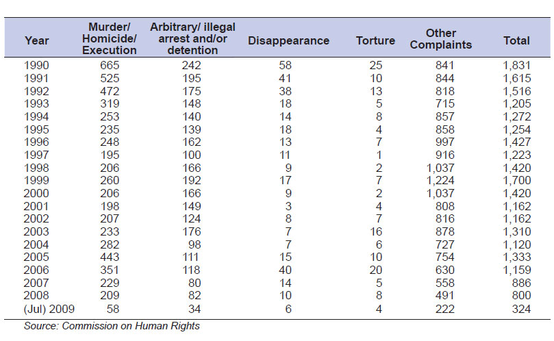 The Commission on Human Rights (CHR) is a constitutional body created under the 1987 Constitution. Its offices throughout the country record reports of serious illegal incidents believed to be political in nature, in which government persons or political opponents may be the suspected perpetrators. From the data in Table 82 below (1990-2009) it is clear the Philippines still has a high incidence of human rights complaints.