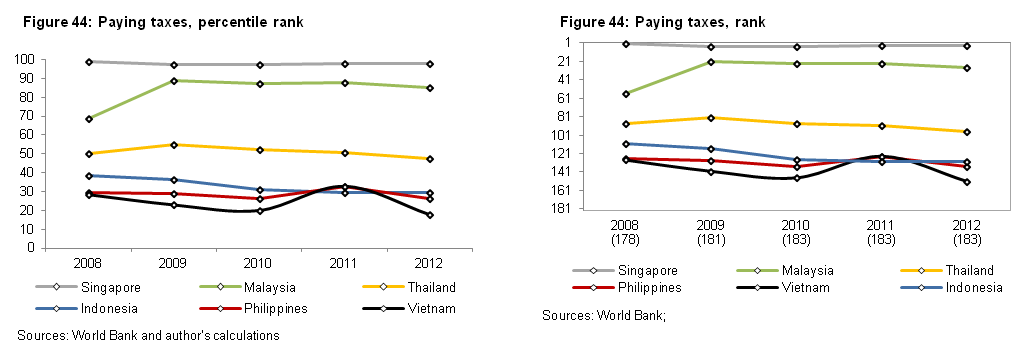 The Paying Taxes Report of the World Bank ranks 183 economies based on total tax rates, payment frequency, and the time needed to comply with tax regulations. In its 2010 report, the Philippines ranked 135th overall and 5th among the ASEAN-6 ahead only of Vietnam. A year before it was ranked 126th, a nine-notch slip being the largest decrease in ranking among the ASEAN-6 (refer to Figure 44 for the percentile rankings).