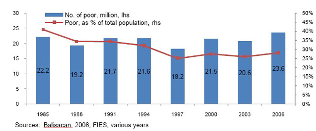 “My biggest frustration as presidential adviser is that 34 quarters of uninterrupted expansion in the past 9 years did little to reduce poverty and the number of poor of people,”Albay Gov. Joey Salceda said… While the Arroyo administration continued to crank out glowing economic growth data, “these rosy figures cannot hide the fact that there are more poor people now than when the president started her term.” He cited data from the NCSB which showed that the number of poor Filipinos—5-member families living on a little more than P1,200 a month—rose to 27.6 million in 2006 from 25.5 million in 2001. In addition, the incidence of hunger nearly doubled from 11.4% in 2000 to 20.3%last year. “Given our avenge economic growth in the last four decades, it would take 37 years for these poor to get out of poverty.”