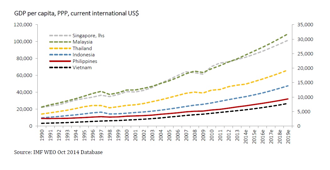 Figure 7: GDP per capita, PPP current international US$, ASEAN-6, 1990-2020e