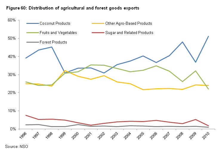 The Philippines has little formal central planning seeking to create economies of scale for competitive agricultural export products such as the current leaders: coconut, fish, seaweed, sugar, and tropical fruits (e.g. bananas, mangoes, papaya, and pineapple).