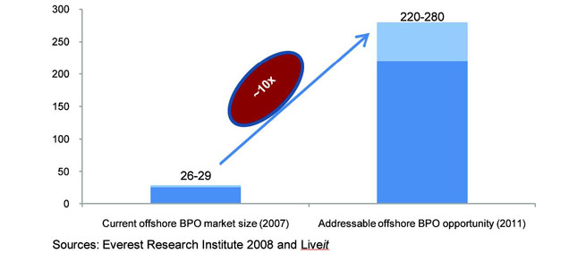 A leading industry research institute estimates current additional opportunities at over US$ 200 billion, eight times the value currently delivered from outside North America (see Figure 64). It is reasonable to describe industry potential in the decade ahead as capable of reaching as high as two million employees and US$ 30 billion in annual revenues. Non-voice employment is growing at a slightly faster rate than voice, and more and more large foreign firms are establishing in-house back-office operations in the country to join the outsourcing firms that are also here. Table 24 shows the rate of employment growth in 2009 of the IT-BPO subsectors showing that back-office or non-voice BPO is currently growing at 25% compared with call centers (23%).43
