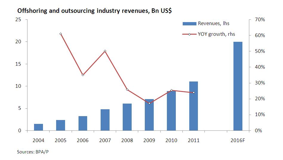 According to BPAP, the industry has experienced increasing employment growth rates from 2004 to 2007 for back-office processes and software development at average rates of 60% and 33% respectively, while voice-based services had a declining growth rate, although still averaging 52% in the same timeframe.