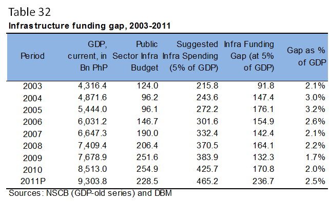 Table 32: Infrastructure funding gap (Bn PhP), 2003-2010