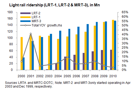 Modern roads and rail support the high-growth sectors of BPO, manufacturing, and tourism. Modern toll roads and better farm-to-market roads provide tourists better access to destinations. In large urban areas particularly Manila a more extensive light rail system moves both employees and tourists more efficiently and eases traffic congestion on major thoroughfares.